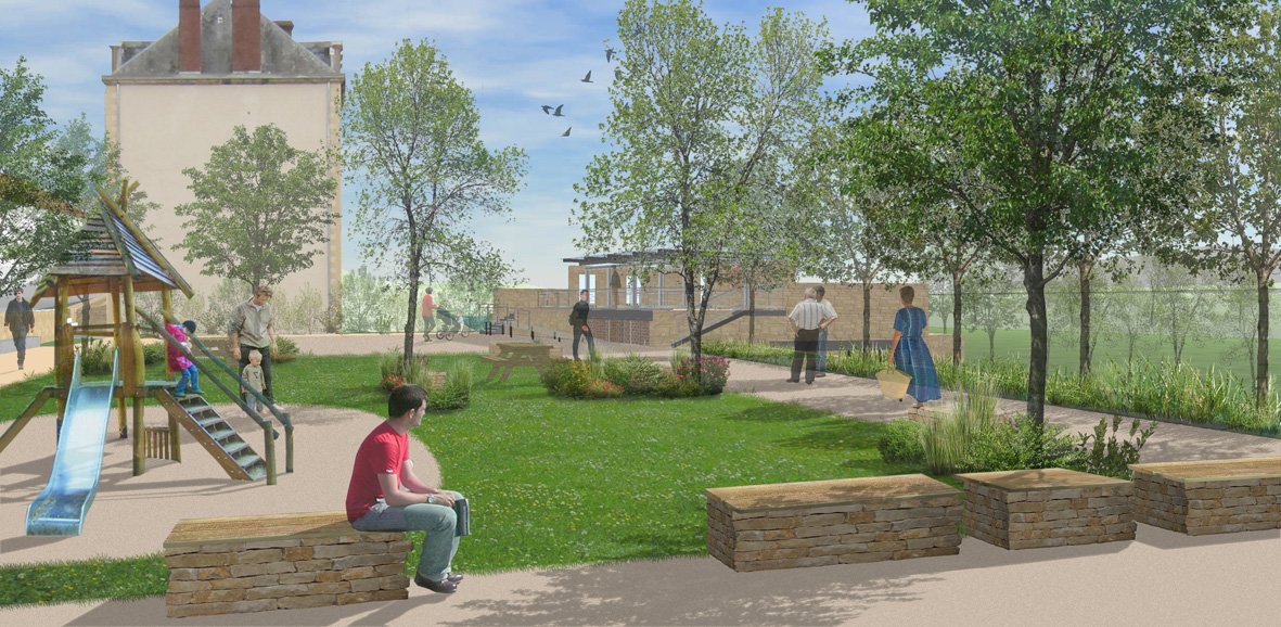 – Requalifier les vestiges de l’ancienne minoterie, afin de mettre en scène le patrimoine industriel pour en faire une plateforme belvédère ouverte sur la rivière de l’Orne.