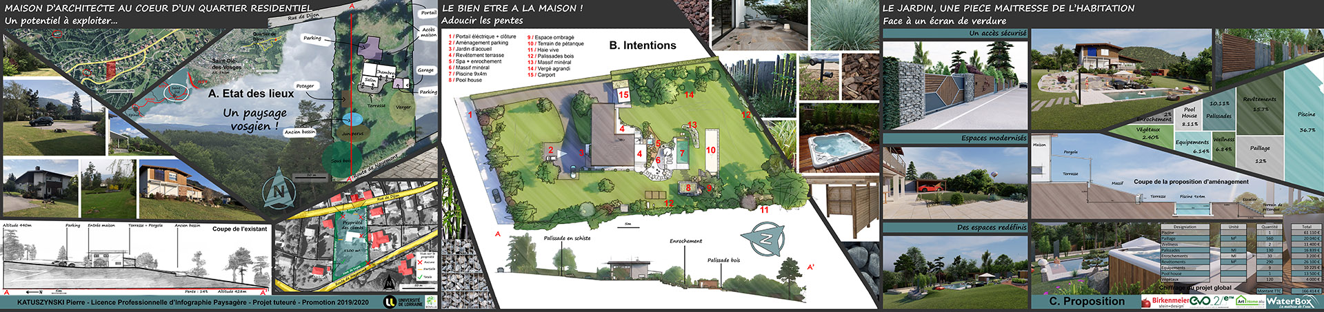 La propriété se situe en plein quartier résidentiel sur les hauteurs de Saint-Dié-des-Vosges avec une belle vue sur la ligne bleue des Vosges. Il s’agit d’une maison d’architecte des années 60, acquise en 2009 par les propriétaires actuels. La demande initiale des clients était la création d’une piscine de 9x4m, permettant de réorganiser leur terrain (pente à 14%). Cette simulation reflète le jardin idéal pour cette famille.