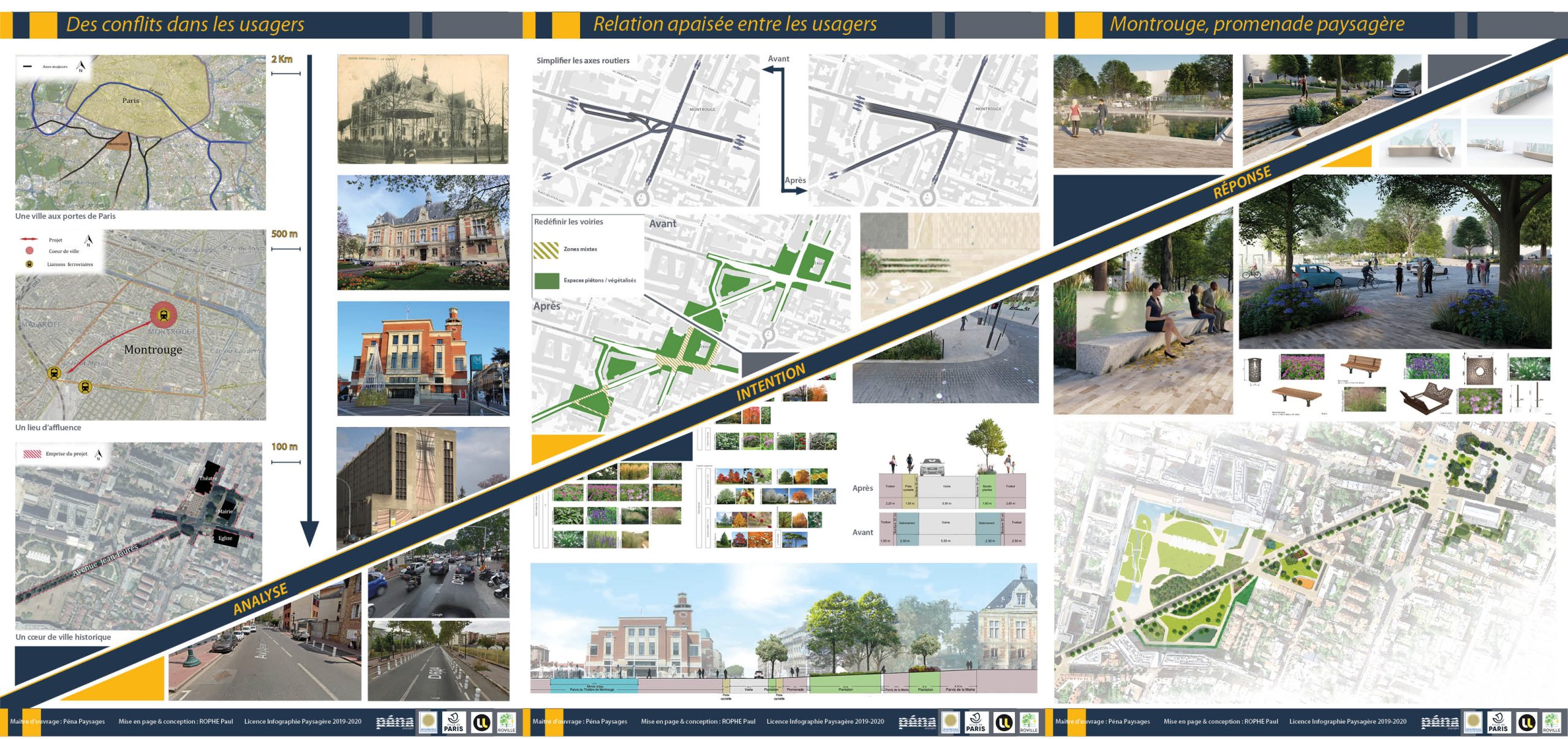 Comment créer de la fertilité en ville alors que les espaces sont déjà circonscrits, tenus, fonctionnels ? Comment passer d’une logique de voirie départementale homogène et banalisée à une véritable promenade des jardins ? Tel est l’enjeu du projet des allées Jean-Jaurès à Montrouge. Depuis le centre-ville à la future station du métro du Grand Paris Chatillon-Montrouge, notre projet propose une transformation radicale de l’espace public en installant une promenade du côté sud de la rue, desservant un chapelet de squares et de parcs. Cette asymétrie est possible grâce à la réduction drastique des emprises circulées et stationnées au bénéfice des modes doux et des espaces plantés. Notre projet consiste également à établir un dialogue entre les monuments remarquables du centre-ville (Mairie, Beffroi, Eglise Saint Jacques) grâce à un vaste plateau paysager en pierre calcaire.