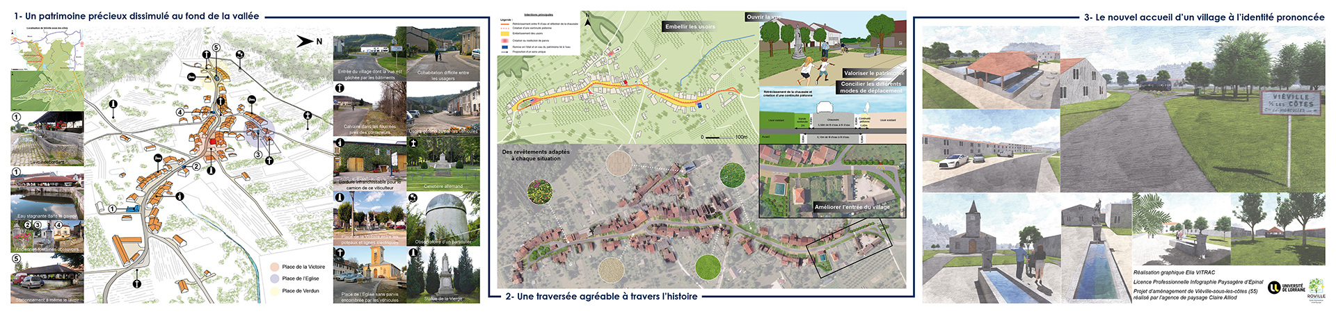 Au pieds des côtes de Meuse, dans la vallée de la Vau, Viéville-sous-les-côtes s’est bâti au fil de l’eau. La proposition d’aménagement permet à ce petit village de renouer avec son histoire tout en répondant aux conflits d’usages liés à l’envahissement de l’espace public par la voiture. Elle consiste en une meilleure organisation des usoirs et une mise en valeur des places identitaires du village, accentuant ainsi l’aspect touristique de Viéville-sous-les-côtes.